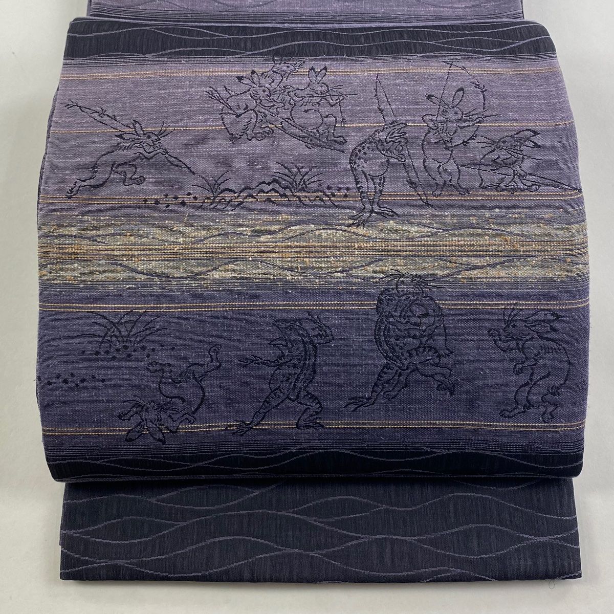 袋帯 鳥獣戯画 よろけ縞 紫 六通 正絹