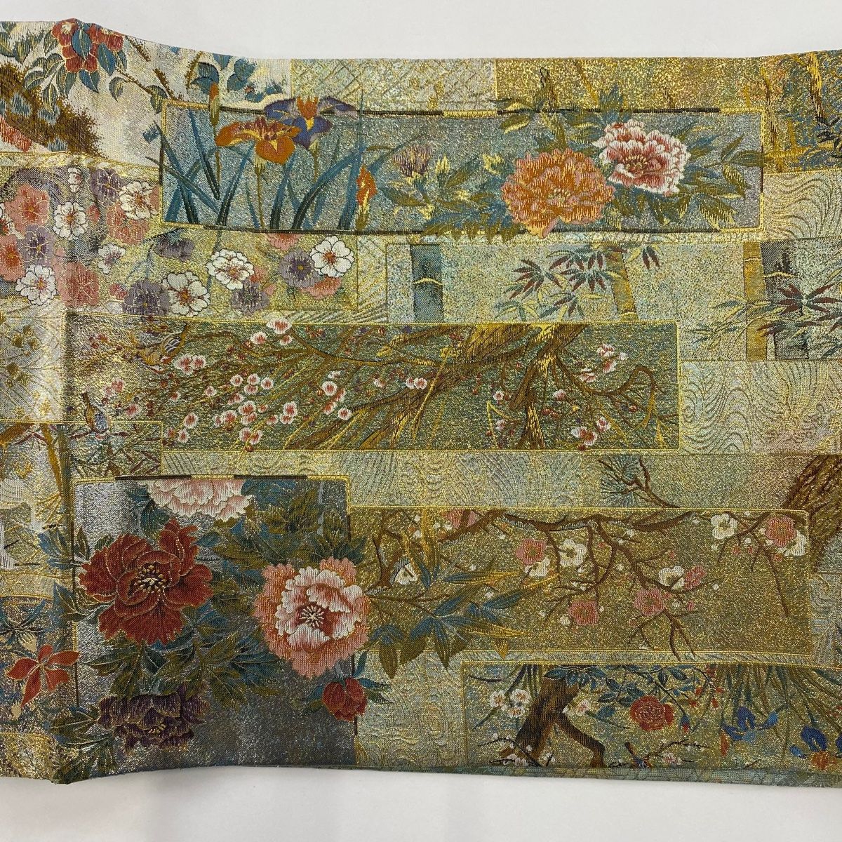 袋帯 短冊 花鳥 箔 金糸 薄緑 全通 正絹