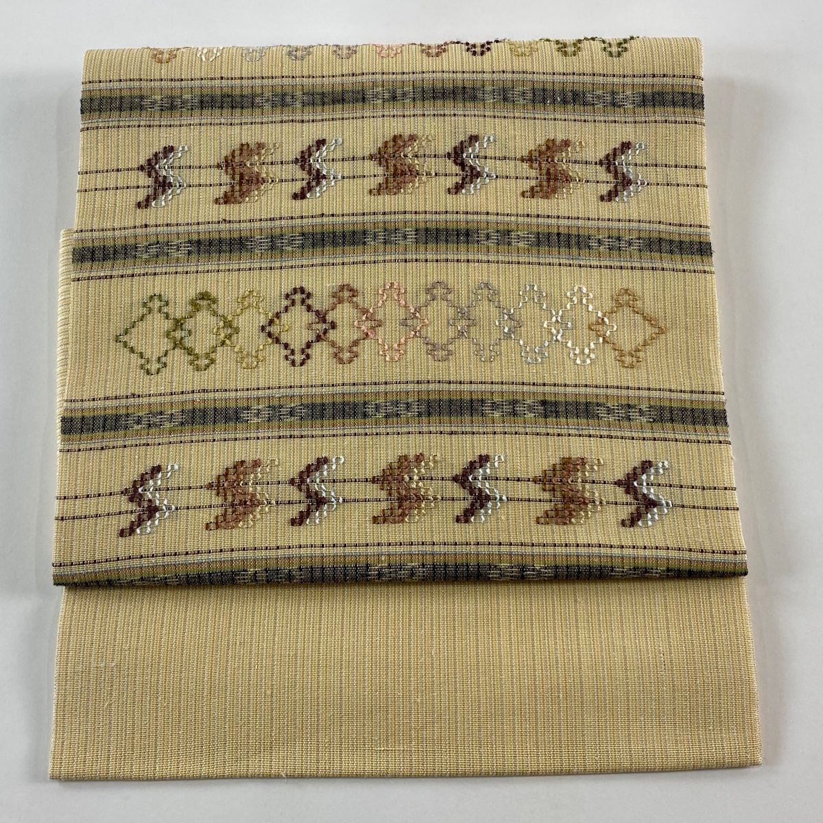 付け帯 証紙 紬地 作り帯 横段 幾何学模様 首里手花織 ベージュ 正絹