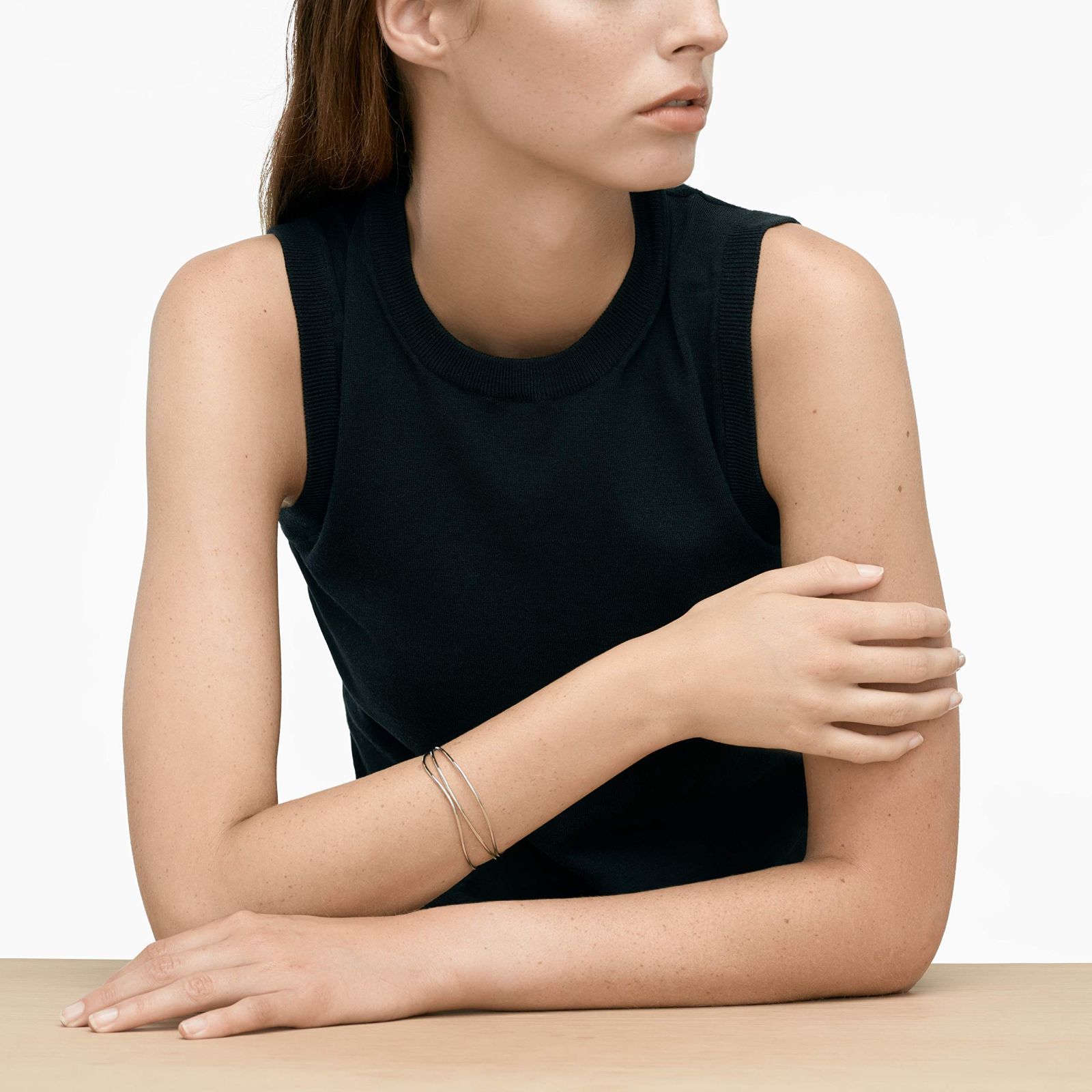 このオープンエンドデザインのシルバートーンのバングルは有機的な形をした3本のワイヤーが特徴です。