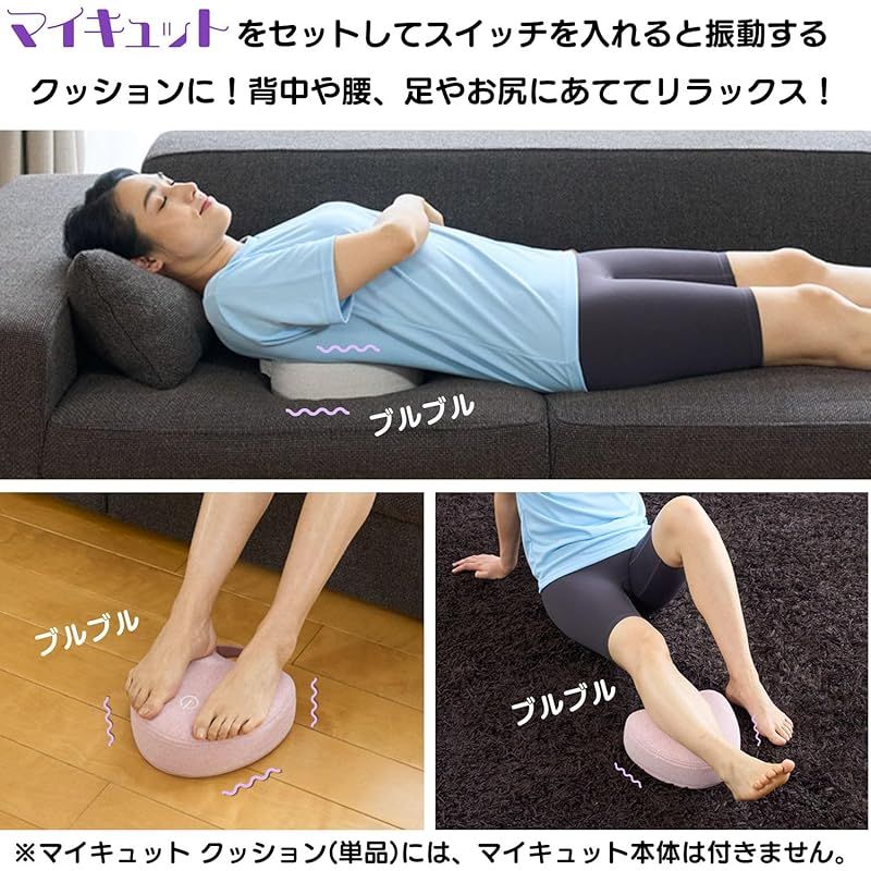 マイキュットクッションは、マイキュットをセットすることで、クッション全体が振動します。(マイキュット本体は別売り)腰、背中、足の裏などお好みの部位に当てて使用できるだけでなく、座ったり立ったり寝転んだりと様々な体勢で快適に使えます。さらに持ち手が付いており持ち運びが簡単なので、どこでも手軽にご利用いただけます。