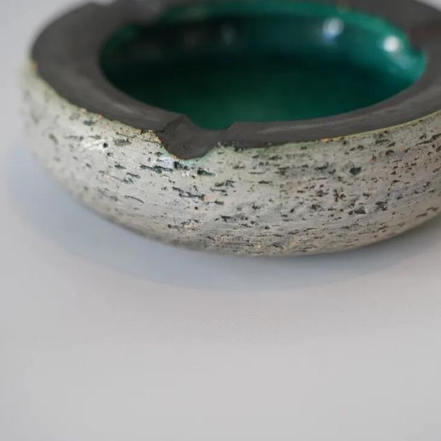 内側のコバルトグリーンの釉薬が施されており、トップのセメントカラーとコンビネーションで重厚で、深み、存在感のあるミッドセンチュリー陶器の魅力を伝えてくれるアイテムです。