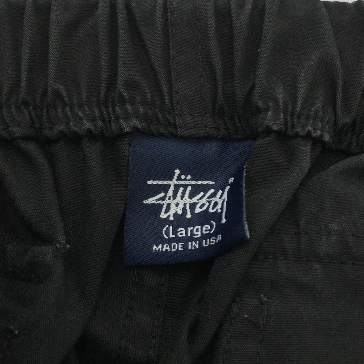 90年代に製造されたOLD Stussyのイージーパンツです。ブラックカラーで、素材はコットンとポリエステルを使用しています。アメリカ製で、90年代中期タグが特徴です。ストリートスタイルやリラックスした着こなしに最適です。使用感が見られますが、新品ならではの風合いを楽しめます。ウエストはドローコードで調整可能です。普段使いにいかがでしょうか。