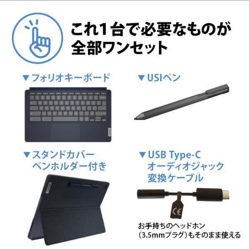 付属品:ACアダプター、USBケーブル、USB Type-C - 3.5mmオーディオジャック変換ケーブル、ペン ホルダー、Lenovo USIペン