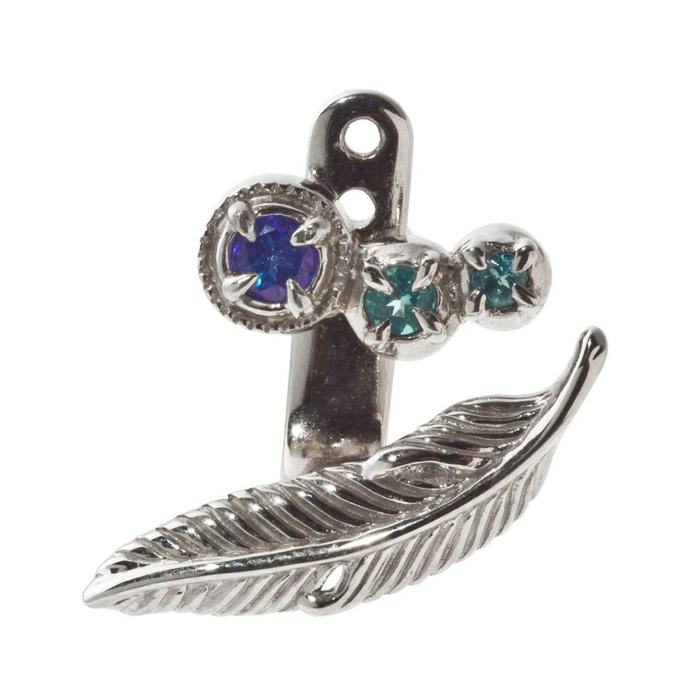 耳元に軽やかな翼を—。三連のスタッドに、耳たぶの下でそっと弧を描くフェザージャケットを合わせた2WAYピアスです。フロントには、虹色にきらめくブルーのミスティックトパーズ、澄んだブルートパーズ、柔らかなアクアマリンを並べ、青のグラデーションに深みを添えました。ジャケットはポストに差し込みキャッチで固定するだけ。耳の厚みに合わせて高さを微調整でき、単体のスタッドとしても洗練された表情に。フェザーは“飛躍・上昇”の象徴。小さな一片に前向きな力を宿します。地金はロジウムコーティングを施したシルバーで、変色しにくく清潔感のある艶をキープ。アトリエで一つひとつ成形・石留め・磨きを重ね、肌に触れる面まで滑らかに仕上げました。日常にも特別な夜にも、横顔をモードに引き上げる小さなアートピースです。※1個売り(片耳分)。