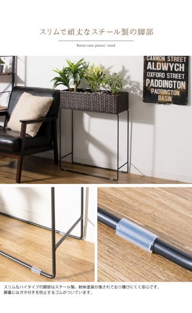 説明美しいラタンが空間を彩ってくれるプランタースタンドGrand(グラン)。天板部分は約55cmと背が高めなので、水やりなどのお手入れも手が届きやすくとてもラクに。ポリエチレン製の人工ラタンは丈夫で水を弾くので玄関先などでもご使用になれます。カラーはダークブラウンとホワイトの2色をご用意。お好みやインテリアに合わせてお選びください。