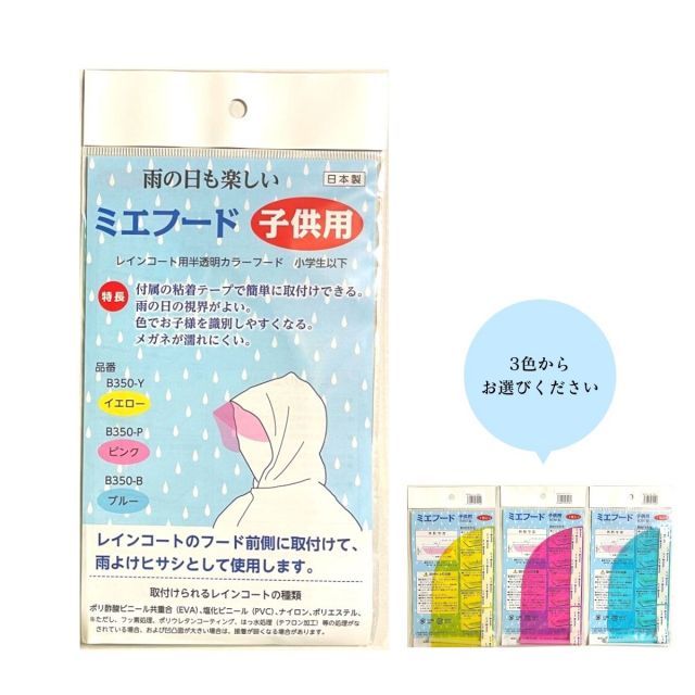 レインコートに貼りつけできる半透明 フード ミエフード 子供用 セット からお選びください イエロー ピンク ブルー 小学生 保育園 幼稚園 視界確保 見やすい 雨具 グッズ 後付けパーツ 視認性 シールド 防災