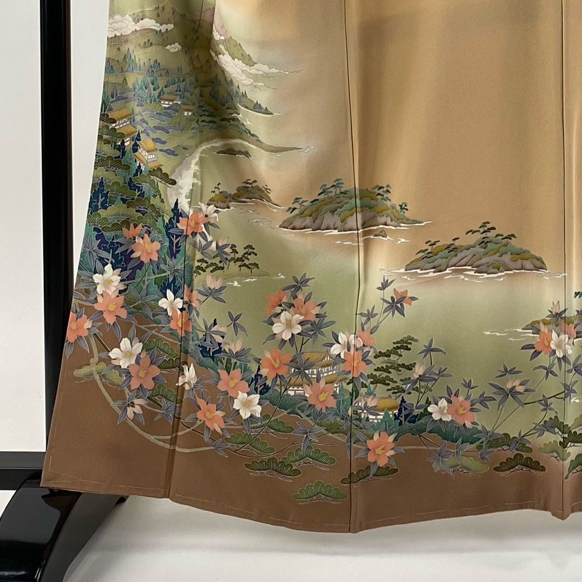 色留袖 身丈161 cm 裄丈68 L 袷 落款 風景 草花 ぼかし ベージュ 正絹 秀品 一つ紋