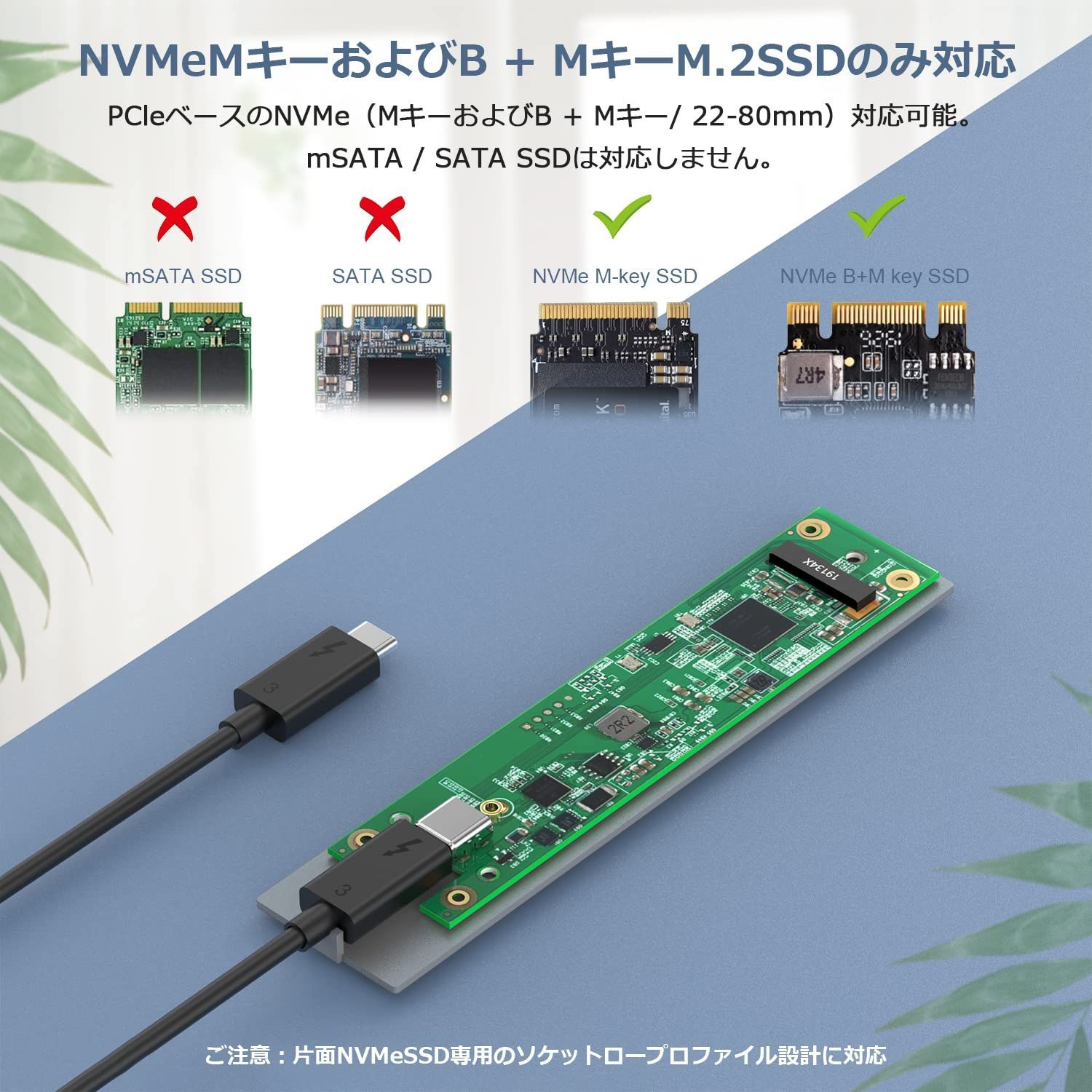 【NVMe PCIe M.2 SSD専用】: M-KeyおよびB+MキーのNVMe PCIeベースのSSDに対応するThunderbolt 3 M.2 SSDエンクロージャー。最大4TBの容量までサポートし、サイズ2280の固体ドライブに適用。ファイルのバックアップ、ディスクのアップグレード、クローン、データの回復、ストレージの拡張などに便利。シングルサイドのSSDのみサポート。【NGFF SATAベースのBキーおよびM&BキーM.2 SSD、M.2 PCIe AHCI SSD、mSATA SSD、B Key NVMeは非対応。Samsung PlusバージョンSSDは非推奨。】