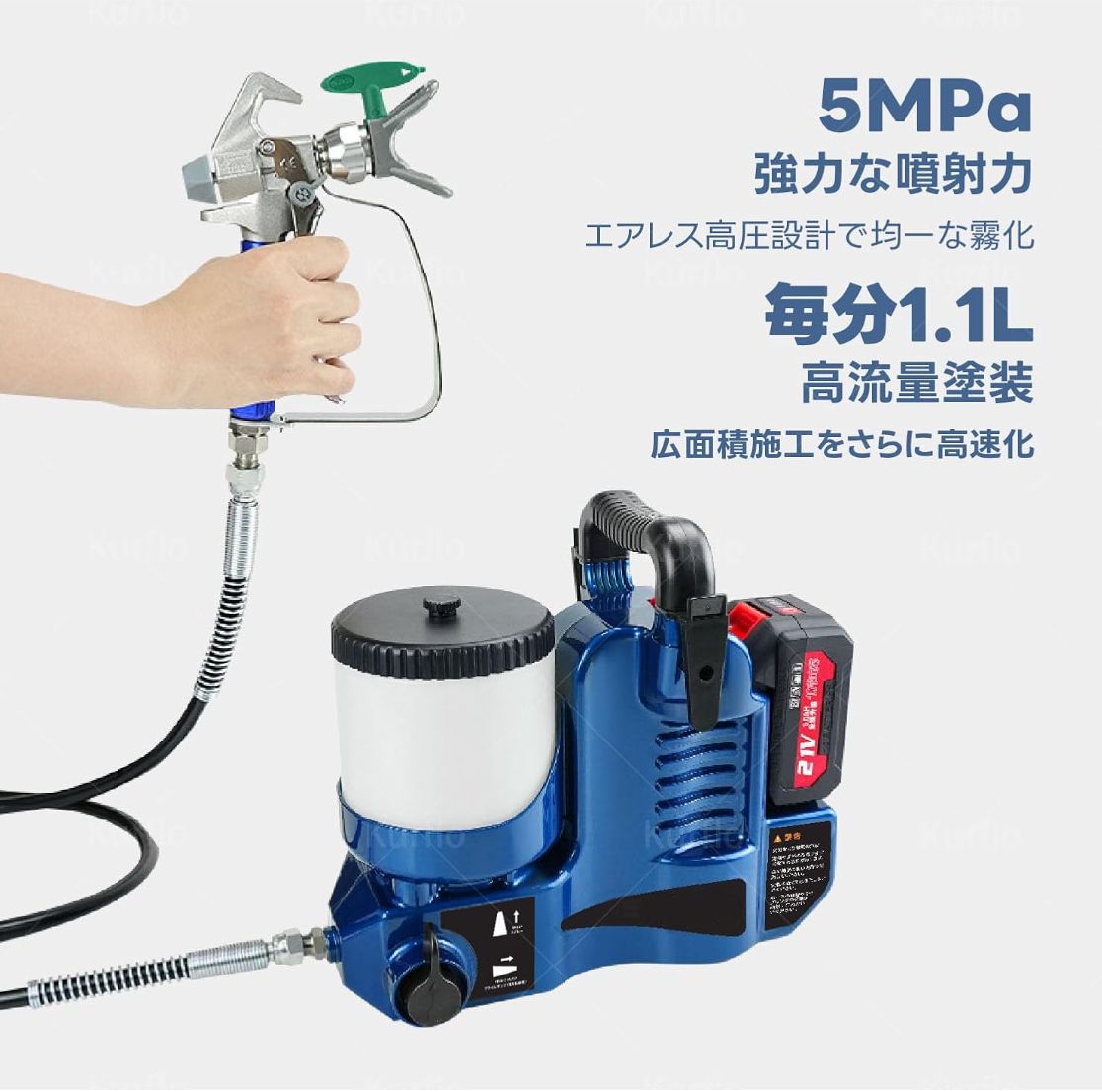 【21V大容量リチウムバッテリー駆動】Kurflo 電動スプレーガンは21V/5Aの大容量リチウムバッテリーを搭載。強力なパワーと長時間駆動で、屋外作業や電源のない現場でも効率的に稼働します。
