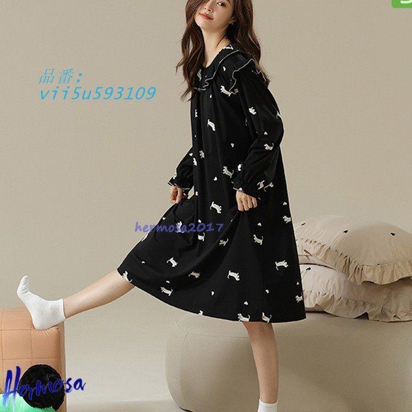 春秋 ネグリジェ レディース パジャマ ルームワンピース コットン 肌に優しい カジュアル ゆったり 犬柄 綿 薄手 家着 ロング丈 長袖 vii 5 u 593109
