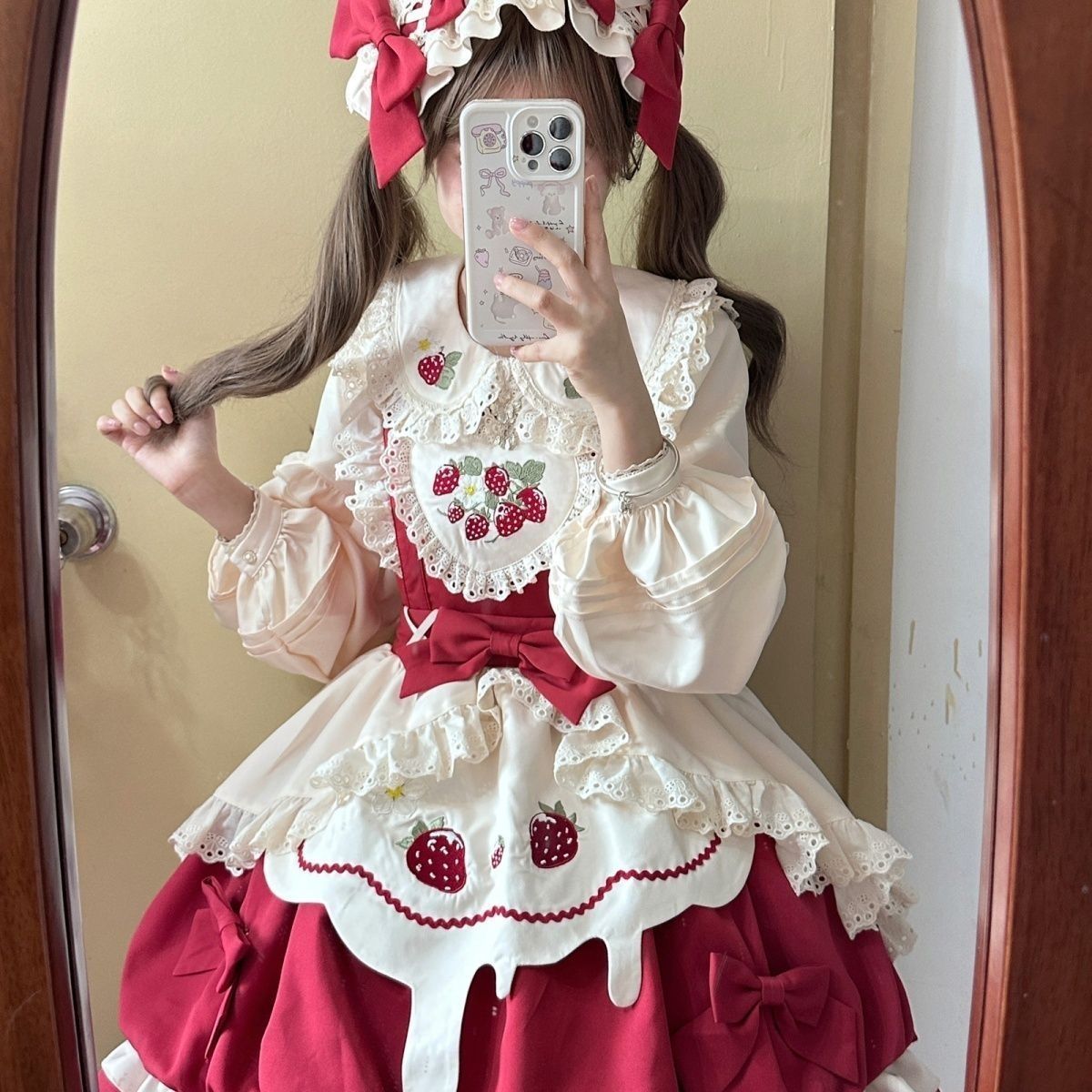 デザイン: 甘ロリ風の苺柄ワンピース、リボンとフリル装飾が可愛らしさを引き立てます