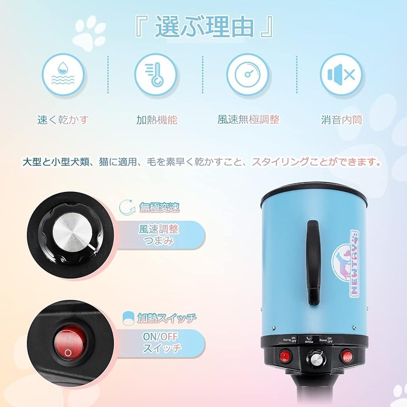 NEWTRY ペットドライヤー 犬用 ペット用 ドライヤー ブロワー 送風機 無段階速度制御 3つのノズル付き ブラシ付き 風速 温度調整 大風量 騒音低減 100 V 50 Hz 60 650-1800 W ブルー