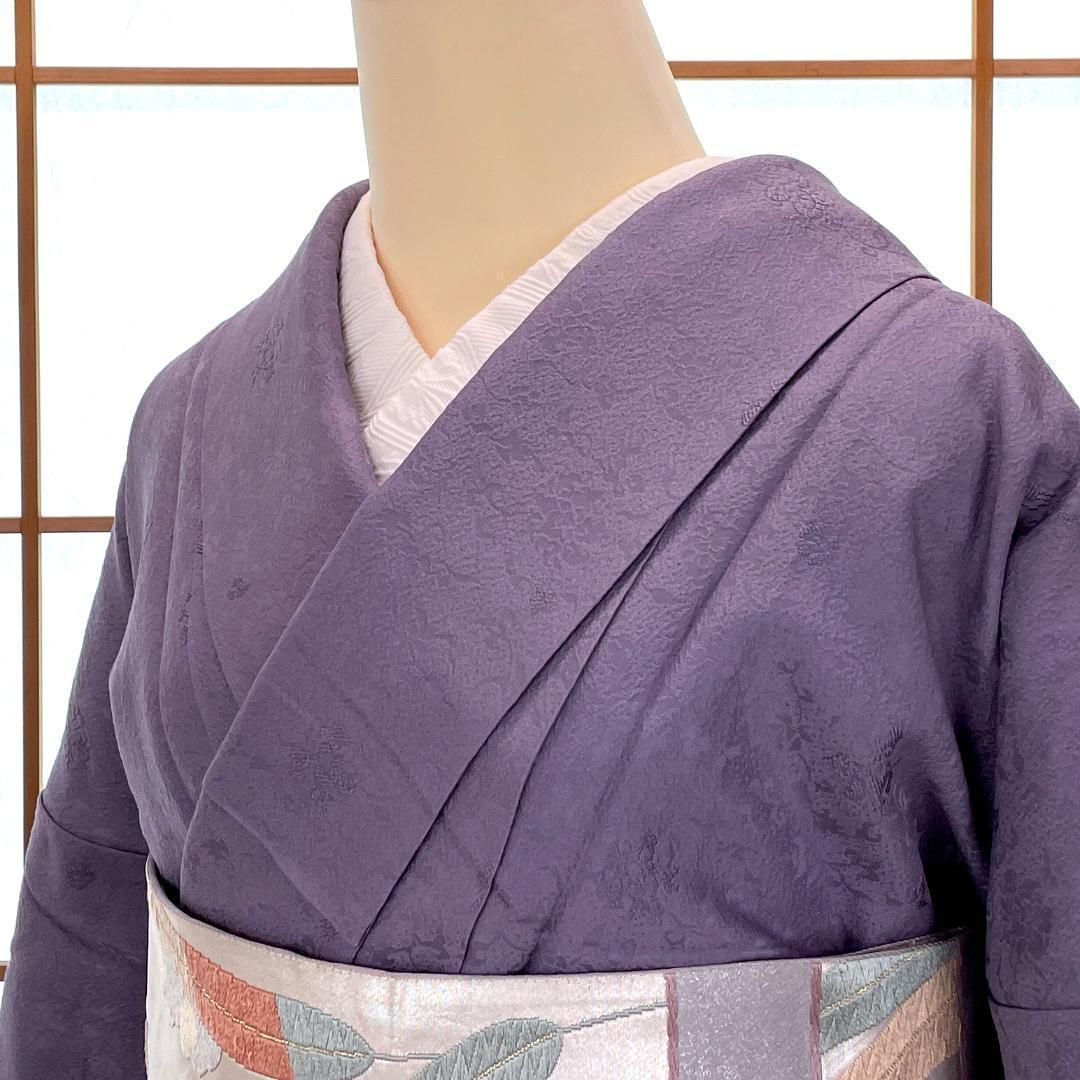 渋みのある藤色の重厚なちりめん地に、花更紗の地紋が織り出された、美しい色無地着物です。(着物のみの出品です)