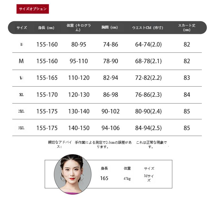 3XLサイズ: 身長155-175cm / 体重140-150斤 / バスト94-106cm / ウエスト84-94cm / 着丈85cm