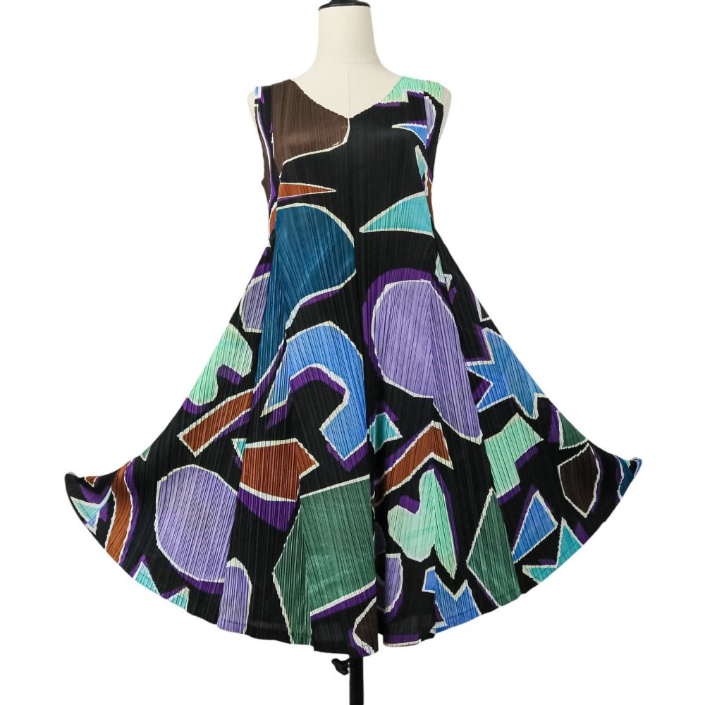 【商品名】プリーツプリーズ イッセイミヤケ 総柄 ノースリーブ チュニックワンピース PP76-JH766 サイズ4 ブラック マルチカラー