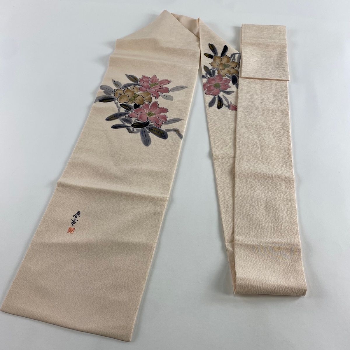 垂先にシミ、手先前柄間に小さなシミ、前柄にシワ、垂先に生地のたわみがございます。