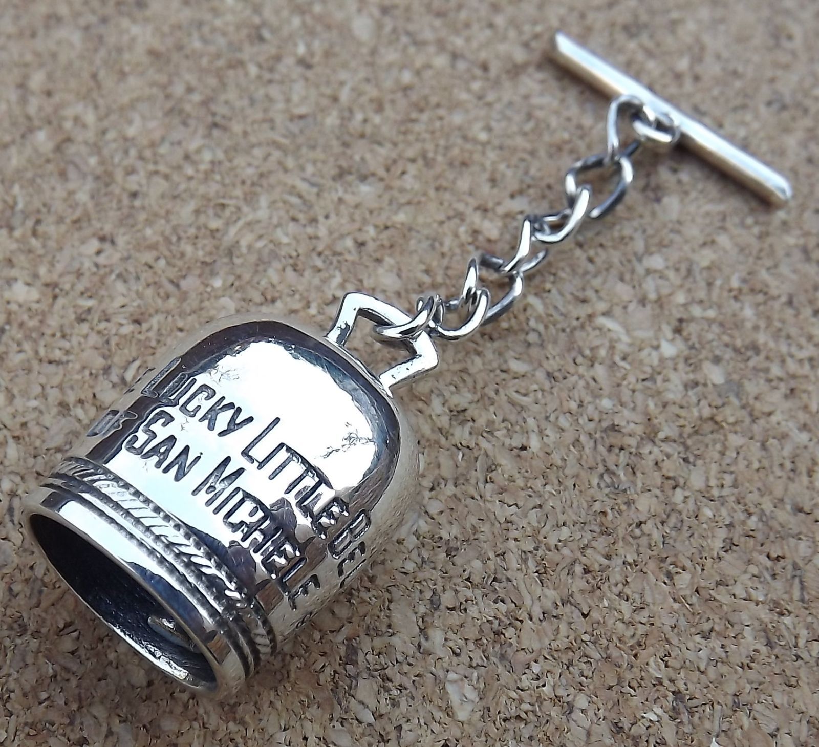 当店で1つだけ温存していた物を今回放出。ベル部分のサイズ:高さ約21.5mm、幅約14.7mm。素材=SILVER925。重さ約8gです。刻印は前面四葉クローバー内にCAPRIとあります。裏面にはTHE LUCKY LITTLE BELL OF SAN MICHELE 925とあります。ベル下部に縄文柄が施されています。リアルマッコズ A-2フライトジャケット のドレスアップにご検討下さい。5枚目画像はリアルマッコイズのA-2に装着しております。中国製のTバーが太い物が近年出回っていますがそちらはTバーが太いためリアルマッコイズのA-2には適しません。当店で検証済。ベルの音も勿論いたします。シルバーアクセサリーで良いベルの音を出す技術が結構難しく、こちら良い音を奏でるクオリティーに仕上げるのにも当店力を注ぎました。5枚目画像はA-2装着時イメージ画像。画像6枚目は歴史資料です。最終在庫です。完売してしまうと材料である銀地金高騰など様々なハードルにより再生産の馬力がもうありません。お見逃しなく!