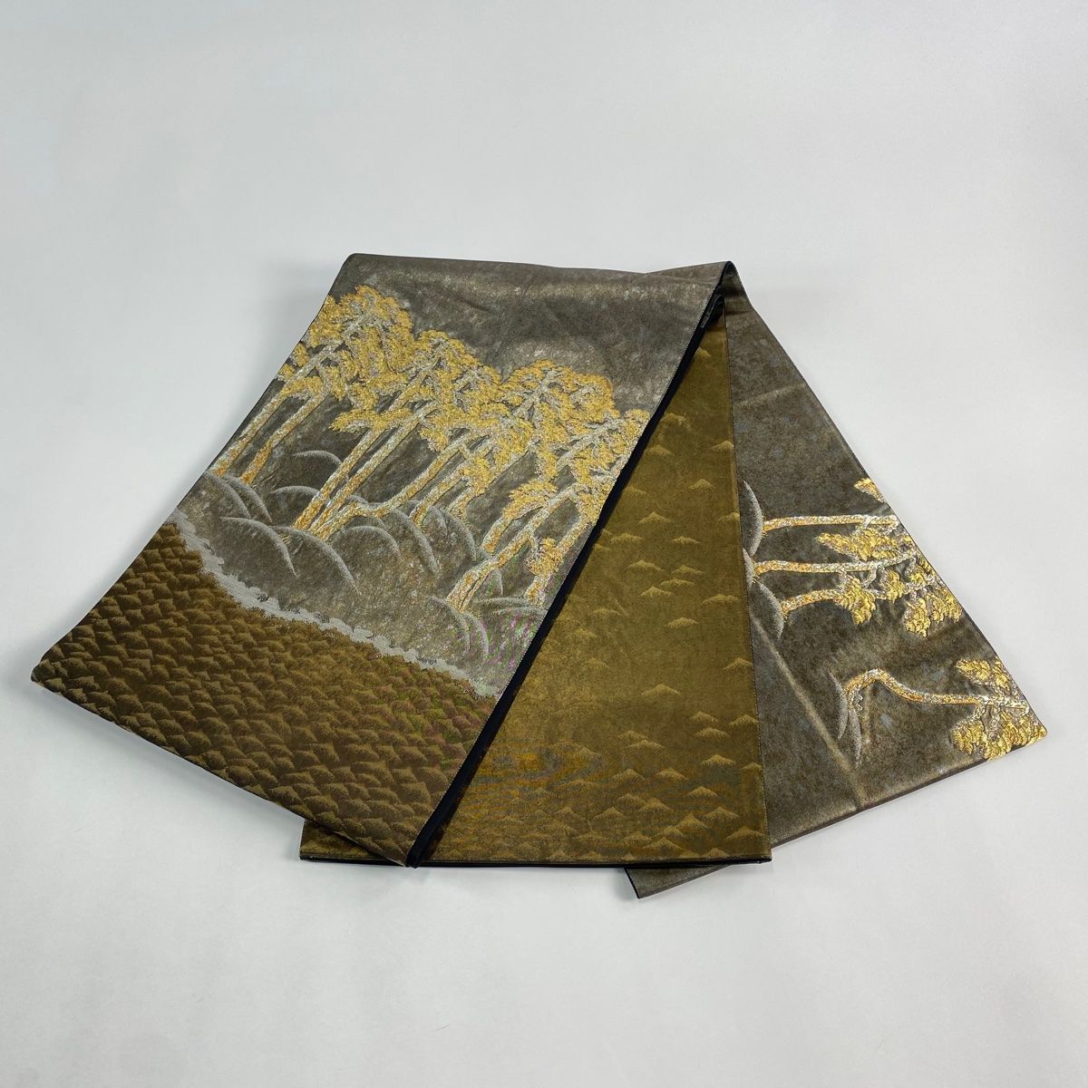 袋帯 じゅらく 落款 横山大観 白砂青松 金銀糸 箔 灰茶 お太鼓柄 正絹