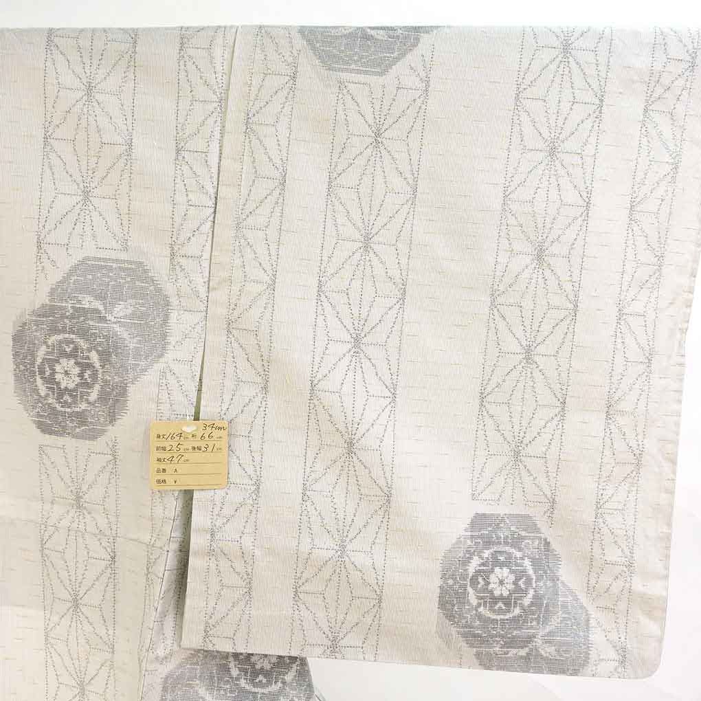 紬 身丈164 cm 裄66 前幅25 後幅31 袖丈47 袖幅34 レディース 単衣 麻の葉 裄長 裄M-Lサイズ 初夏 初秋用 正絹 シルク グレー トールサイズ リメイク リユース リサイクル 呉服のきくや