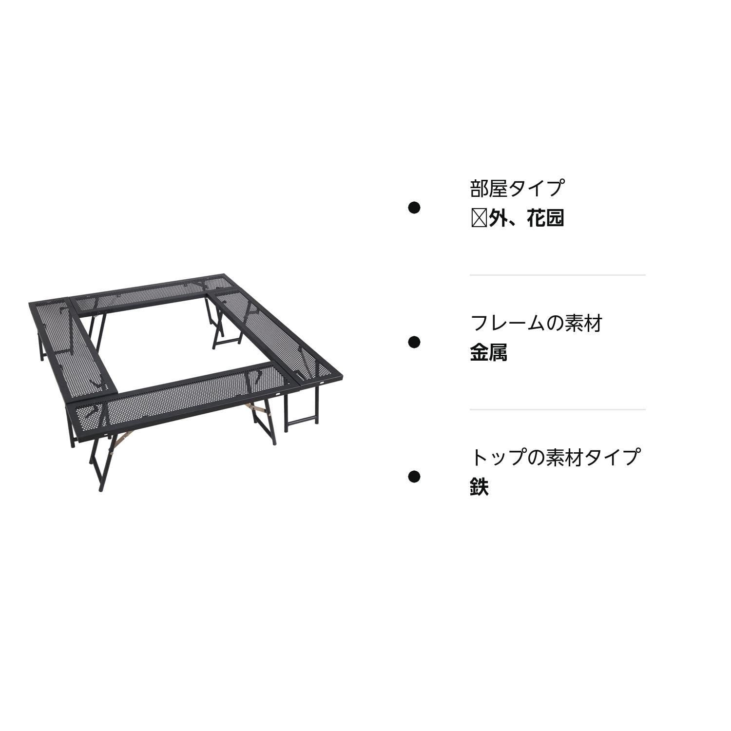 【組立式】囲炉裏タイプ使用時:約108×108cm(内面約68×68cm); テーブル使用時:約88×40(60、80)cm; サイドテーブル使用時:約88×20cm。新しいサポートフットの設計により、テーブルはより堅固で安定し、使用時の耐荷重性が向上します。