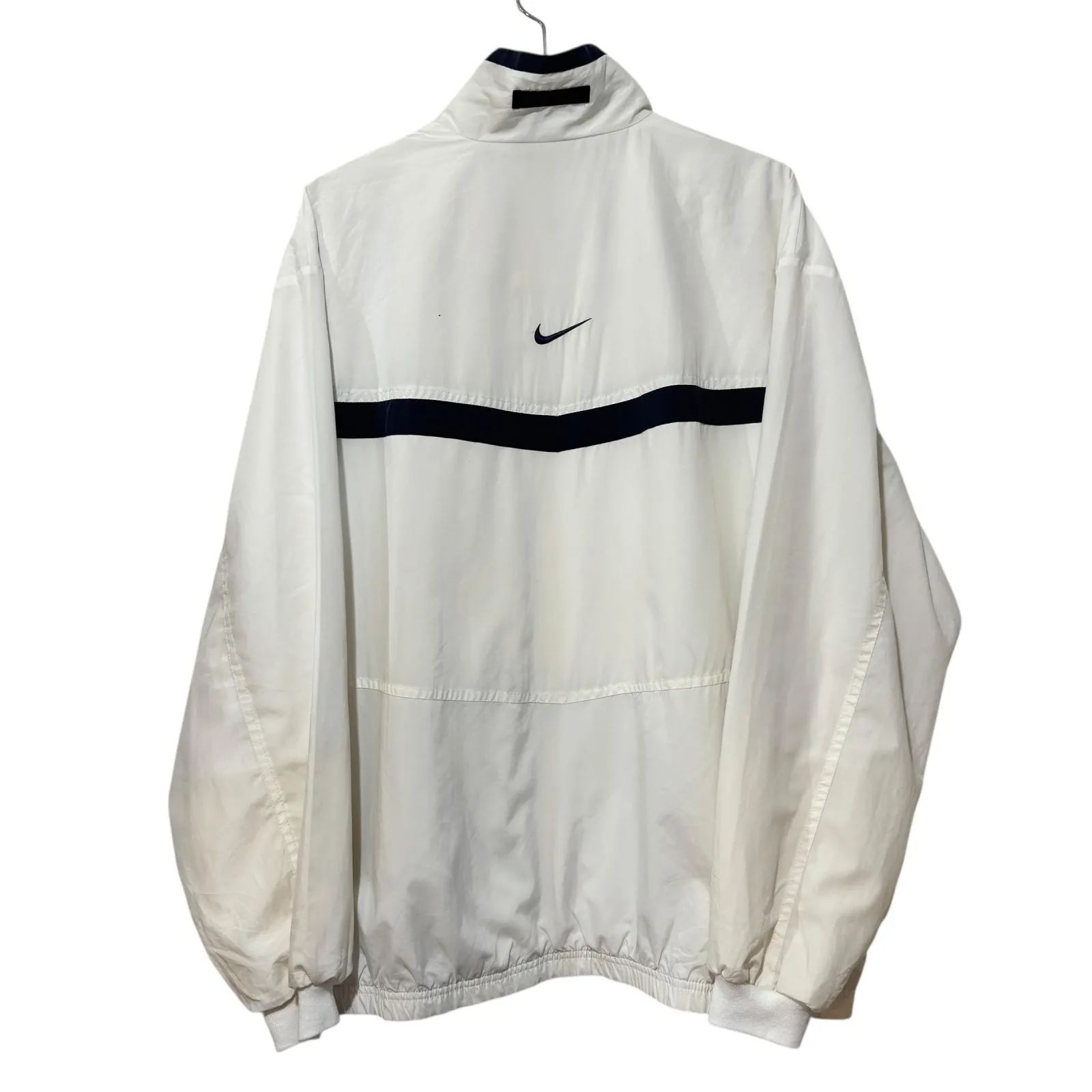90 s NIKE Nylon Zip Track JKT Windbreaker L 白 紺 刺繍 センターロゴ ナイロンジャケット ウインドブレーカー 古着