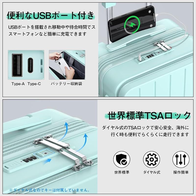 スーツケース 拡張機能付き 機内持ち込み キャリーケース フロントオープン 超軽量 大容量 キャリーバッグ USBポート付き カップホルダー付き 隠しフック機能 ファスナータイプ 静音 ダブルキャスター TSAローク 1