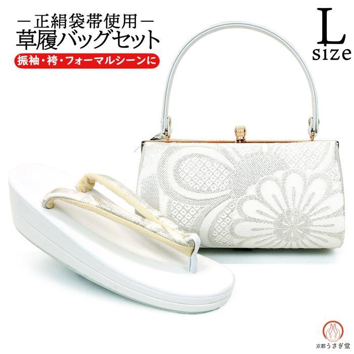 Lサイズ 振袖用 草履バッグセット zb-015 二枚芯 成人式 振袖 訪問着 付下 小紋 ホワイト 白 シルバー 県 は 京都うさぎ堂