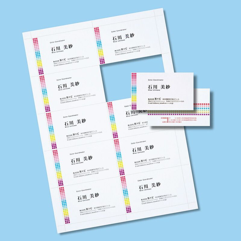 折り曲げるだけで切り離せるマイクロミシンカットタイプの名刺。プリンターを選ばず使えるマルチタイプ。使いやすい標準の厚さで、文字やイラスト中心の印刷に最適。100シート・1000カード入り。マルチタイプ。