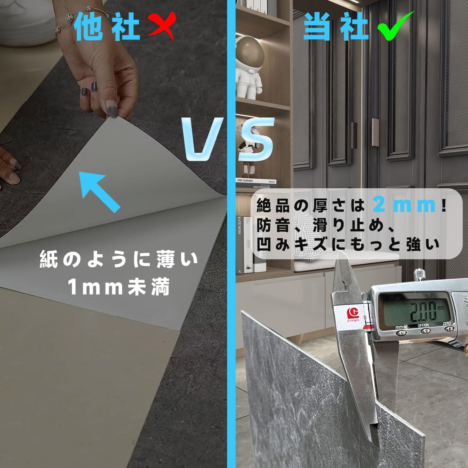 【製品仕様】WOWQのフロアタイルは【厚さ2mm 304.8*304.8mm】/枚の厚手の塩ビ素材で作った床材です。2重塗装されていますので優れた耐久性があります。他社の同価格帯の製品と比べて、2mmの厚みでより価値が高いということです。耐久性も向上させ、床材の寿命も延ばします。それに、厚みの増加によって踏み時の安定感が増す。他社の1.5/1.8mm厚手の製品と比べて、コストパフォーマンスが高い。