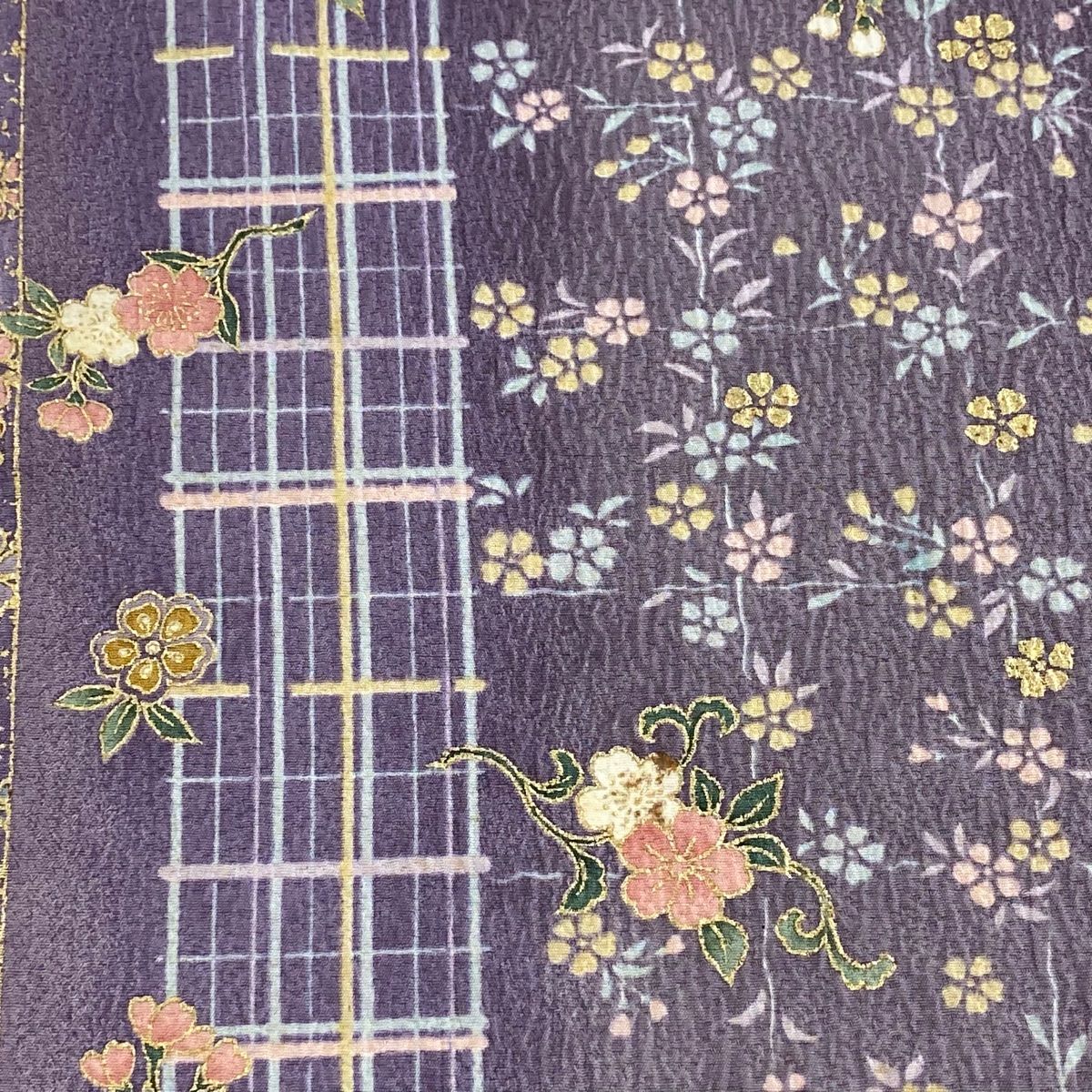 反物 秀品 小紋 草花 格子 金彩 ぼかし 紫 正絹