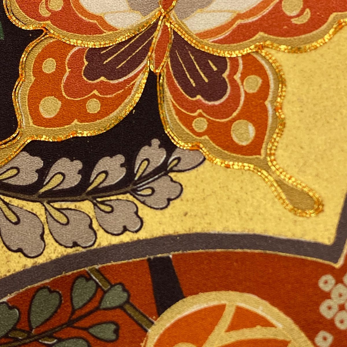 表地所々にヤケ、後身頃の裾付近所々に点シミ、上前にシワ、表地所々に金彩の変色がございます。
