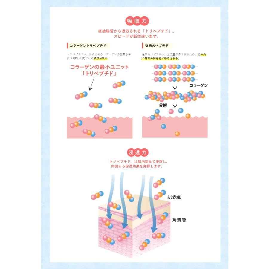 コラーゲン・トリペプチドは通常のコラーゲンに比べて小さな分子サイズが特長の粉末コラーゲンです。千分の一サイズの粒子で、水に溶けやすく、体内にスムーズに吸収されやすい性質があります。健康や美容を意識する方、日々の食生活に栄養サポートを取り入れたい方におすすめです。コラーゲンは、皮膚や骨、腱、靭帯などにも含まれるたんぱく質で、毎日の健康維持に欠かせない成分といわれています。スポーツを楽しむ方や、美容や健康を心がける方のライフスタイルに取り入れやすい商品です。