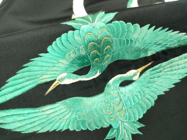 平和屋着物 アンティーク 大正ロマン 九寸名古屋帯 総刺繍 双鶴菱 黒地 金糸 正絹 az