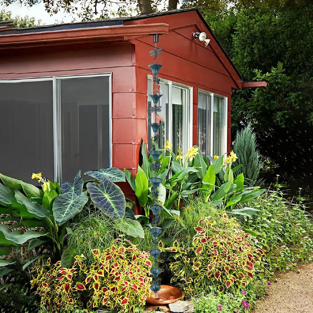 長持ちかつプレミアム品質- 10個のトンボと花の形をしたカップから成る2.6メートルのレトロなレインチェーンです。フラワーカップ(10×5.5cm)とトンボ(9.7×8.5cm)は、良質の鉄、防錆メッキ仕上げで作られています。