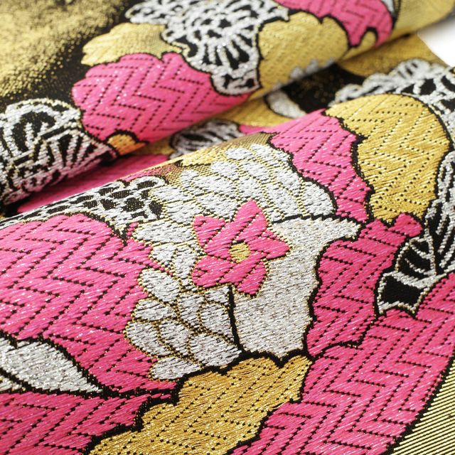 【新品】 すごい値! 袋帯 リサイクル 振袖用 フォーマル 正絹 京都 西陣 黒金 牡丹 花 成人式 結婚式 金銀糸 二十歳 新品 美品 仕立て上がり 春 秋 冬 リサイクル帯 帯 成人式 二十歳 20歳 結婚式 お祝い パーティー などの フォーマルな場面に 振袖 や 訪問着 にもぴったり たとう紙付き 送料無料 販売 購入 リユース すごいね みやがわ neb01567