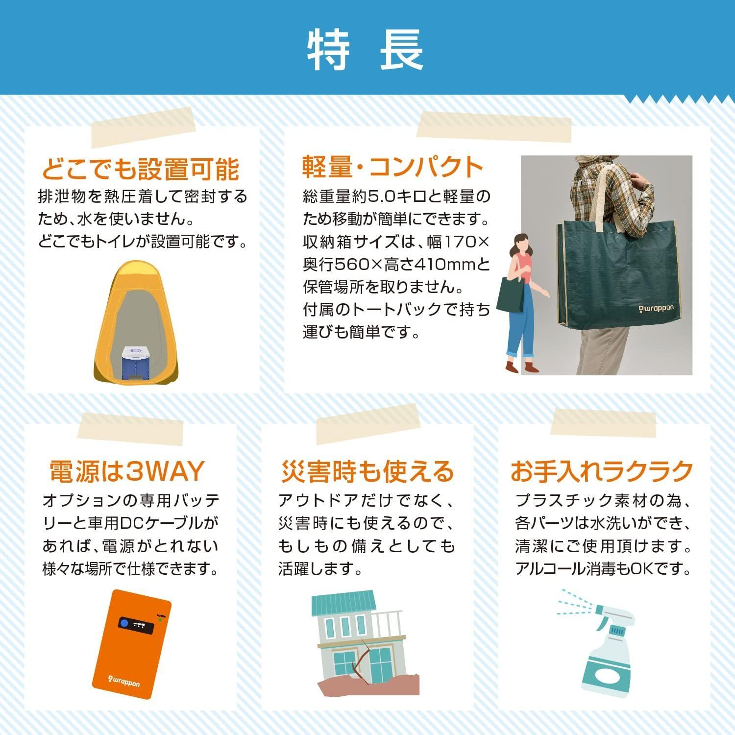 ・密封!弊社独自の熱圧着技術で、袋には直接手を触れずに処理が可能な簡易トイレです。災害などの非常時はもちろん、キャンプやバーベキュー、釣りなどのアウトドア用プライベートトイレとしても活用できます。
