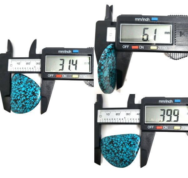 材質:チャイニーズターコイズサイズ:画像のノギスにて確認ください。重さ43.4ct黒い細かなウエブ模様の入った石です。石というのは、1点物です。沢山あるようで、石は出会い。同じ石はありません。お気に入りが見つかったらお早目に決断ください。