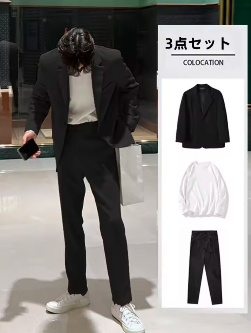 ジャケット・パンツ・インナー(Tシャツ)の3点セットで、コーデに迷うことなくすぐに“完成形”のスタイルが楽しめます。