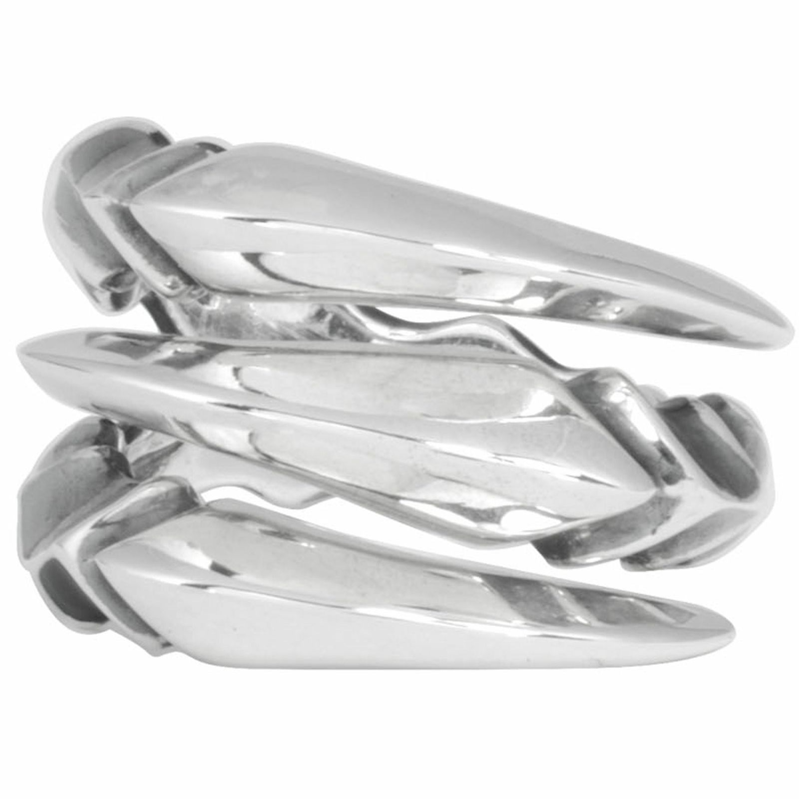 鋭さと洗練を兼ね備えた〈スリーフィンガー・クロウリング〉。三本の爪を想わせる立体的なフォルムは、力強さとモダンな造形美を同時に湛えています。表面はシルバーの光沢を極限まで磨き上げ、滑らかな曲線が光を受けて艶やかに輝く仕上げ。裏面には燻しを効かせた凹凸を施し、陰影のコントラストが彫刻的な存在感を際立たせます。シンプルながらもエッジの効いたデザインは、日常のスタイルにも、モードな装いにも自在に調和。ジェンダーレスに楽しめるバランスで、指先に纏うだけでスタイリングをワンランク引き上げます。素材には確かな品位を誇るSV925を採用。厳選したアトリエにて、一点ごとに丹念なクラフトワークで仕立てられた作品は、手元に宿る現代的なアートピースとして輝きを放ちます。