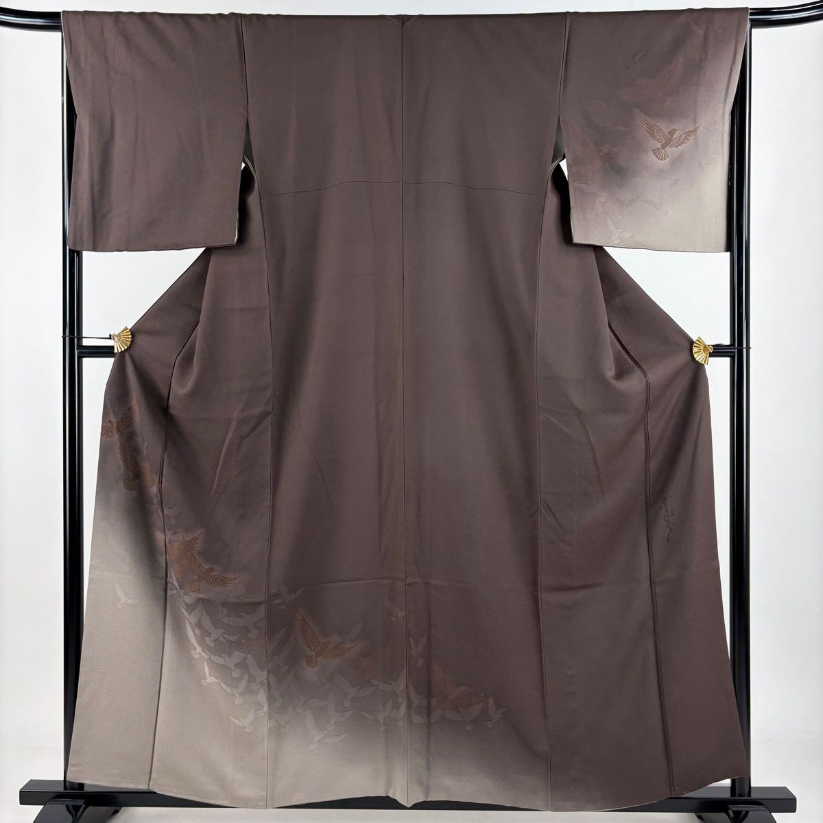 付下げ 身丈158.5 cm 裄丈66.5 M 袷 斉藤三才 落款 鳥 ぼかし 焦茶色 正絹