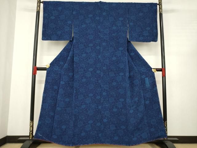 平和屋着物 阿波藍伝統工芸 金子正 小紋 型染め 藍 花唐草文 鬼しぼ縮緬 正絹 ck