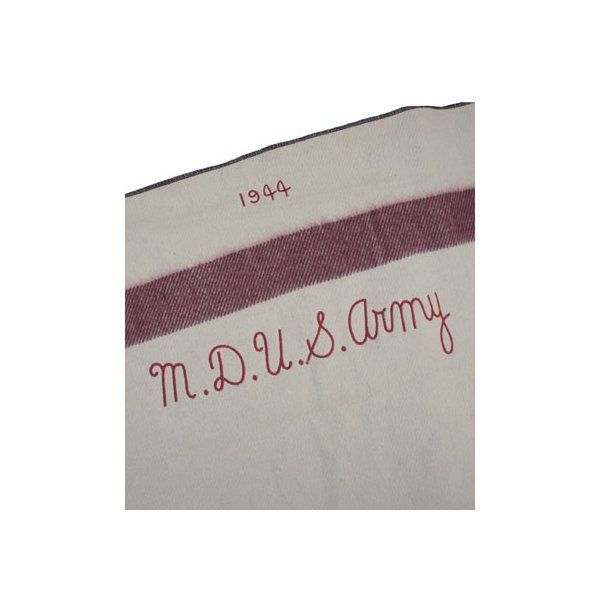 オフホワイトのカラーに上下にエンジーのストライブが入り、アメリカ陸軍医療部M.D.U.S.Armyと、開発製造年1944のイニシャルが刺繍され、ミリタリー満点のブランケットです。