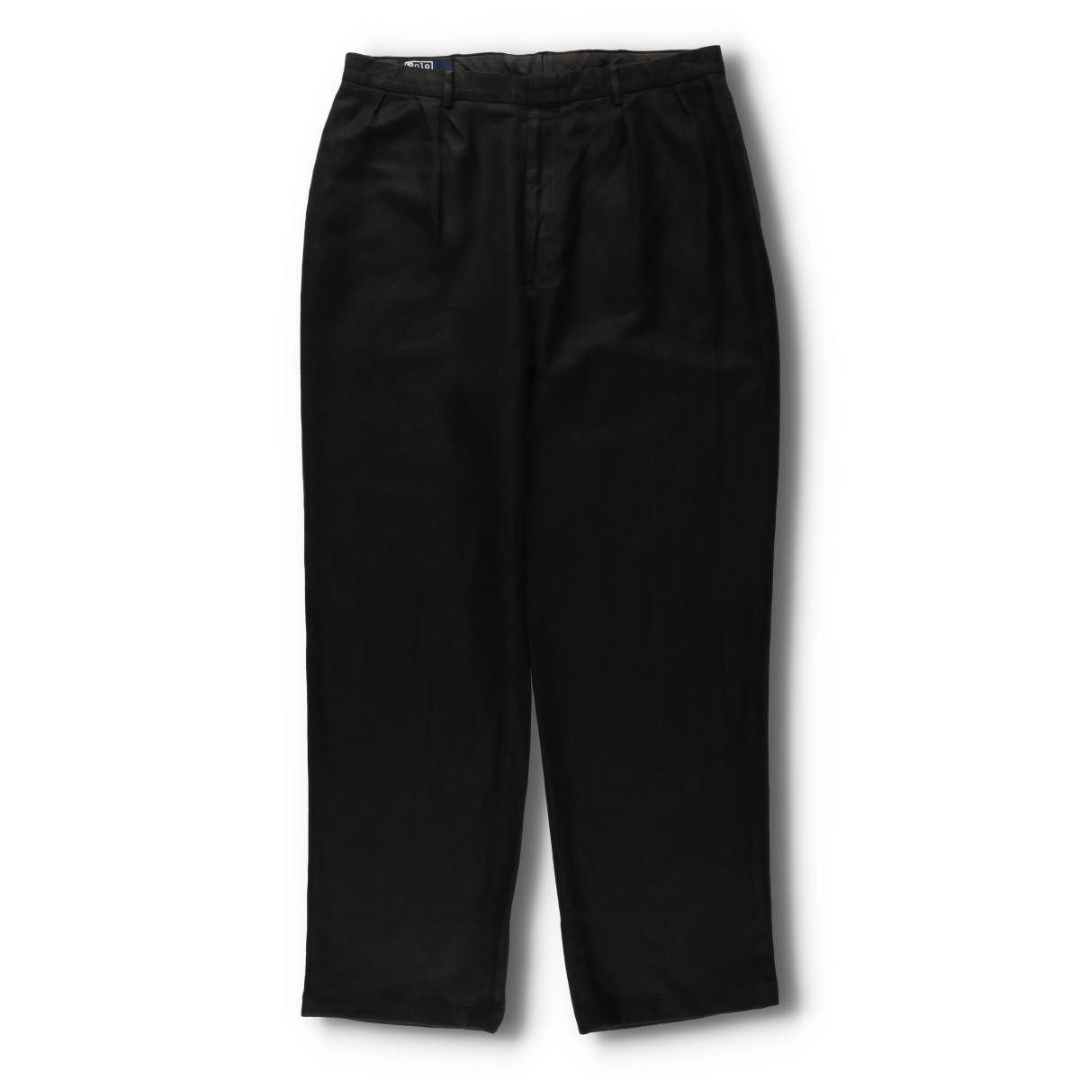 90年代「ポロ・ラルフローレン」のツータックスラックスです。一見するとシンプルな黒のスラックスですが、コットン×リネン混紡のヘリンボーンツイル地。珍しい生地感です。ゆとりを持たせたリラックス感のあるツータックにスラックスです。キレイめなスタイルはもちろん、Tシャツやスウェットと合わせてラフに履きこなすのもクールです。