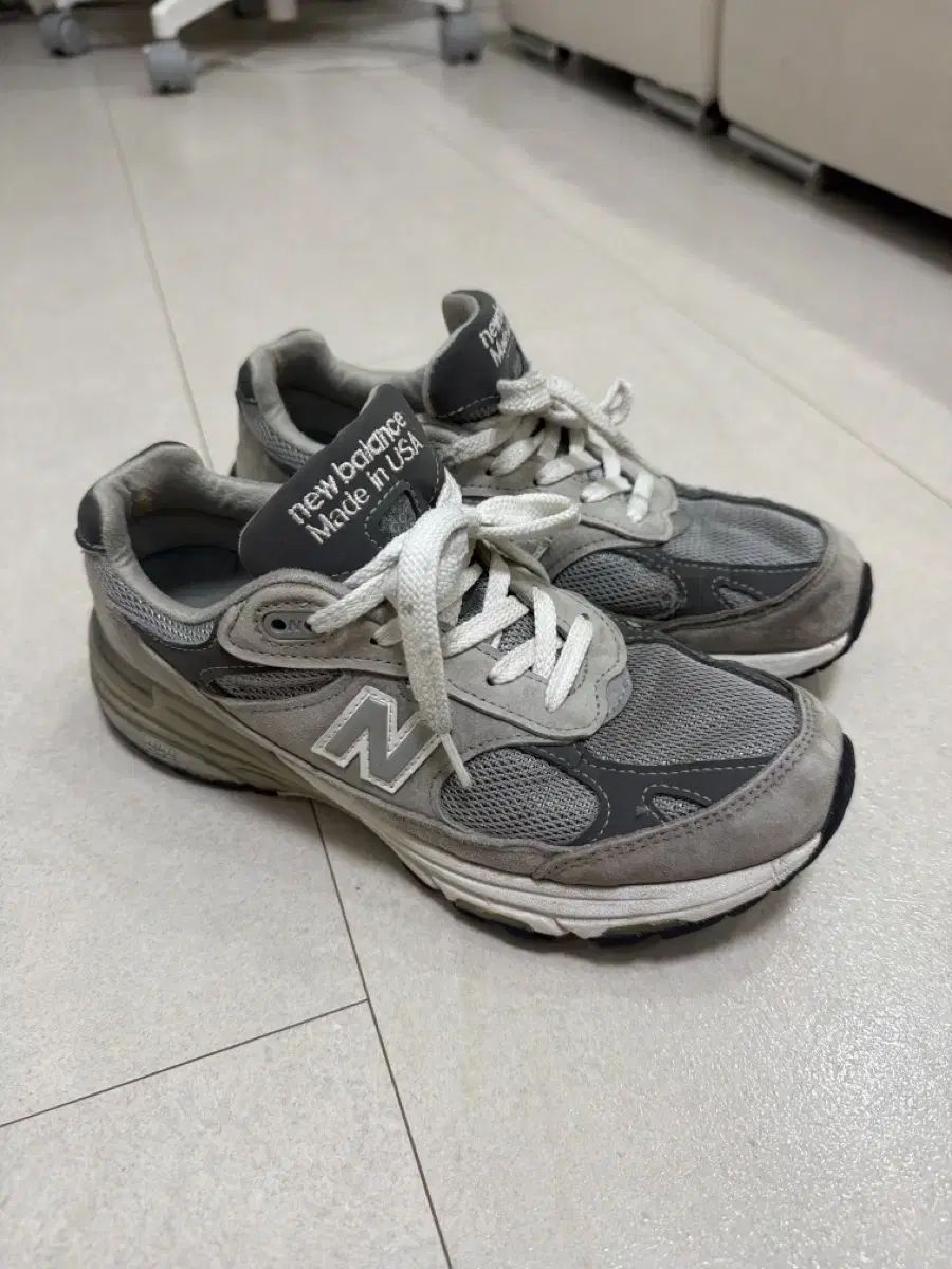 ニューバランス 993 Made in USA モデル 240サイズです。紐は白で結ばれており、全体的に無難なグレーです。写真でご覧の通り、使用感は少しあります。