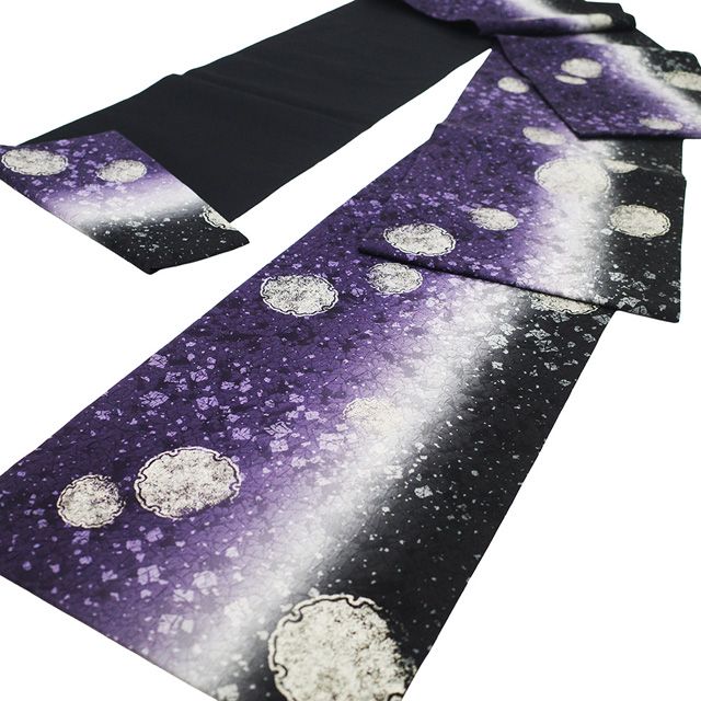 袋帯 正絹 全通 染め帯 染帯 手染め 銀彩加工 紫 黒 ぼかし染 雪輪 箔散らし カジュアル 春 秋 冬 作家物のようなデザイン 仕立て上がり みやがわ sb 54632