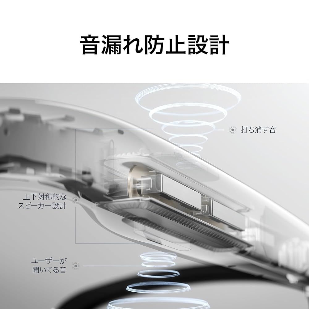 【音漏れ防止設計】前面に配置された対照的な出音設計により音を耳に直接届け、遠くの音波を打ち消します。また周囲の環境を識別し、自動的に音量を調整します