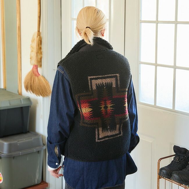 存在感抜群のネイティブ柄が目を惹く着回し自在のボアベストです。