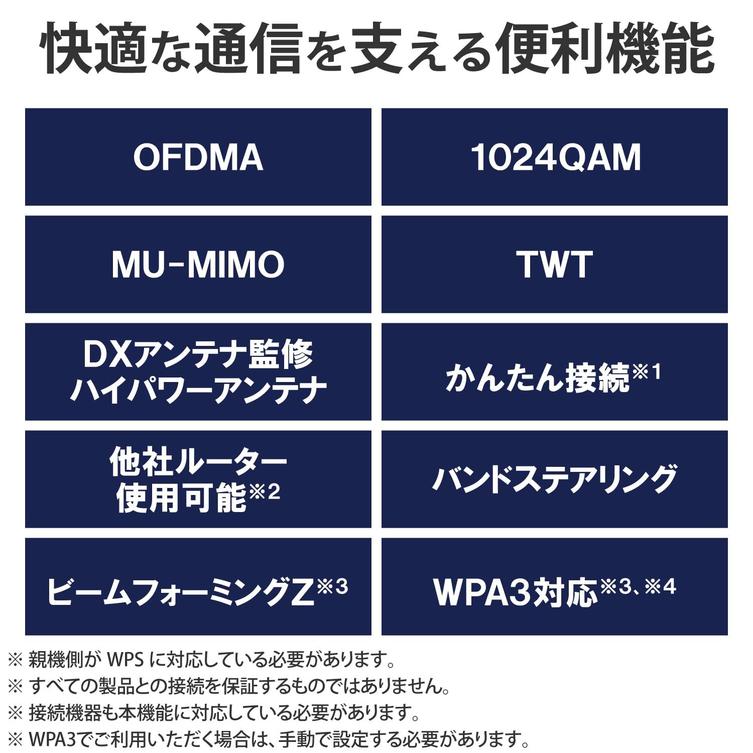 6対応でより安定した高速通信を実現しました。複数台同時接続に強いので、テレワークやオンライン学習に適しています。複数台接続に強いOFDMA、送信情報量をアップする1024QAM、複数台同時接続が可能なMU-MIMO、スマホのバッテリーが長持ちするTWTなど、家族みんながWi-Fiに接続してもストレスフリーな通信を実現します。
