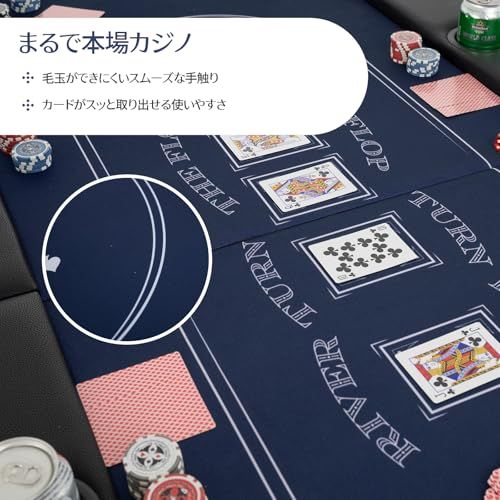 【快適なプレイ体験】ポーカーマットには、厚みと適度な弾力を兼ね備えた素材を採用しており、カードやチップの操作がなめらかに行えます。静音性にも配慮された設計で、プレイ中の余計な音を抑え、落ち着いた雰囲気の中で集中してゲームを楽しむことができます。また、各プレイヤーの腕元には、厚手クッションをPUレザーで仕上げたアームレストを装備します。長時間のプレイでも腕への負担が少なく、快適なプレイ感をサポートします。